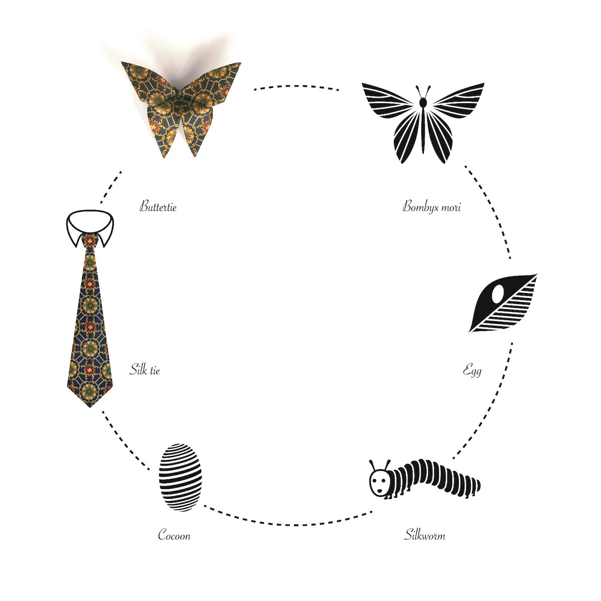 The silk recovered from old ties is reborn in the form of butterflies. This poetic gesture completes nature's cycle and pays tribute to Bombyx mori, the white butterfly at he origin of silk.